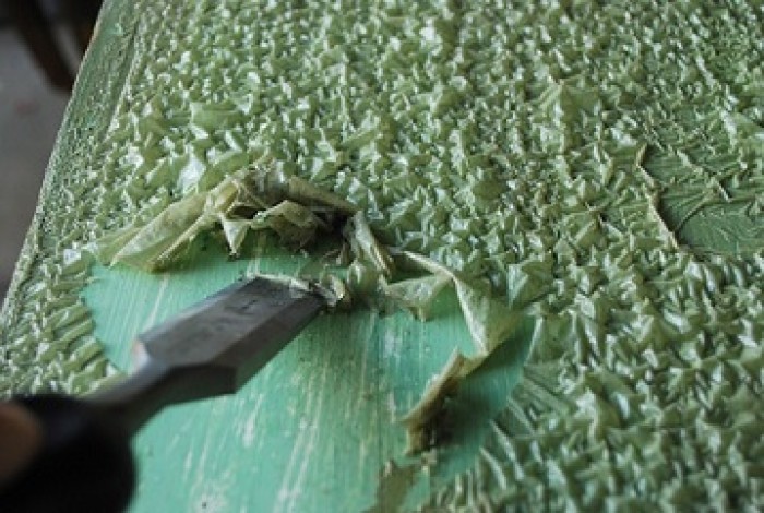 Bước 3: Đợi trong vòng 2 đến 3 phút khi thấy lớp sơn bong tróc ra nghĩa là hóa chất đã tác động làm mềm lớp sơn. Lúc này có thể dùng dao cạo nhẹ là lớp sơn sẽ bong hoàn toàn.